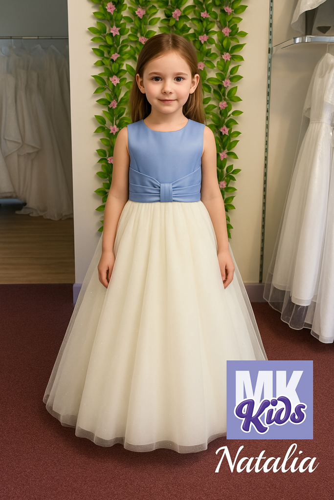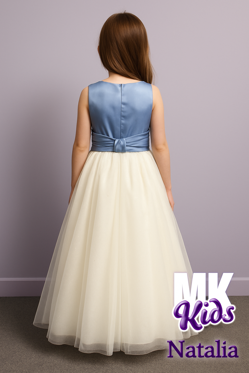 The Natalia is a sweet ballgown flowergirl dress with a smooth cornflower blue satin bodice, ruched waistband and a soft ivory tulle skirt dusted with tiny sparkles, ideal for church aisles, family photos and the dance floor; available in 48 colours.