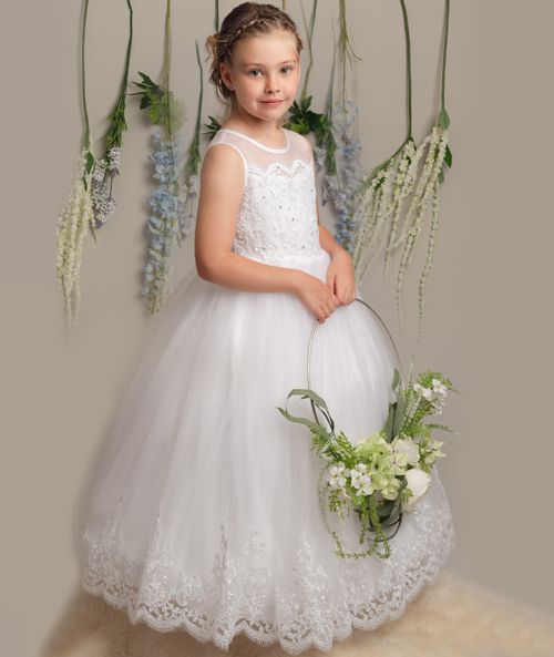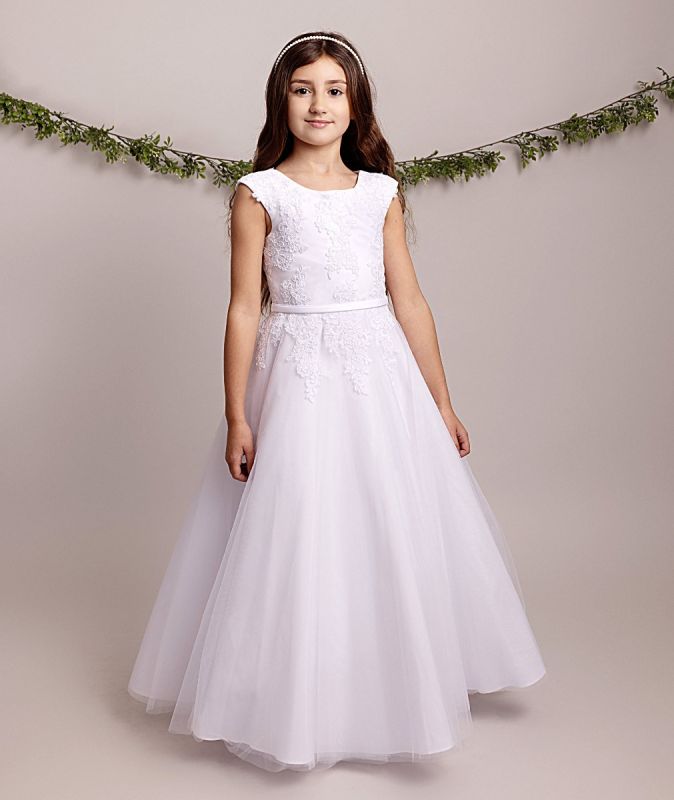 Tiffany is a graceful full-length A-line communion dress from Sevva, featuring a lace-appliqué bodice, slim satin waist belt and a soft tulle skirt in classic white. With its neat cap shoulders and clean, comfortable fit, it’s a lovely choice for girls who want a simple, elegant look on their special day.